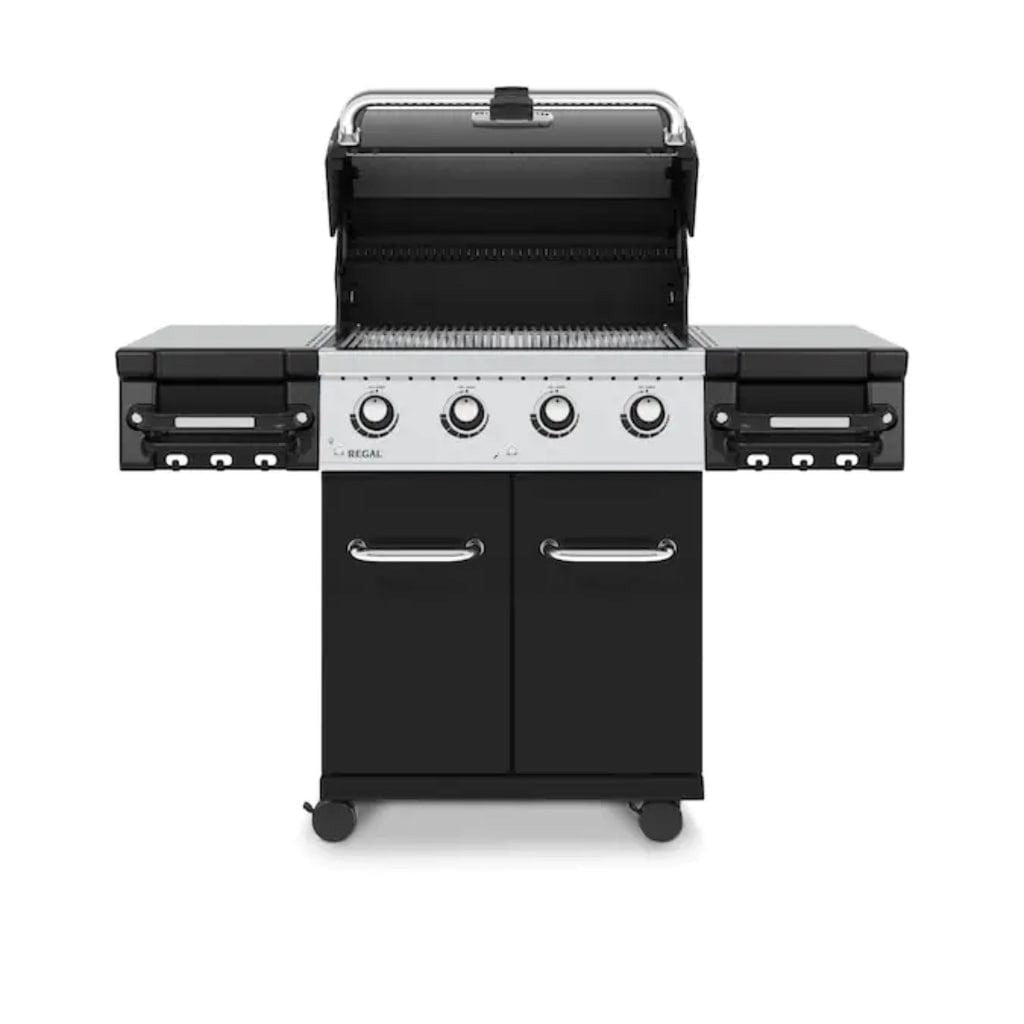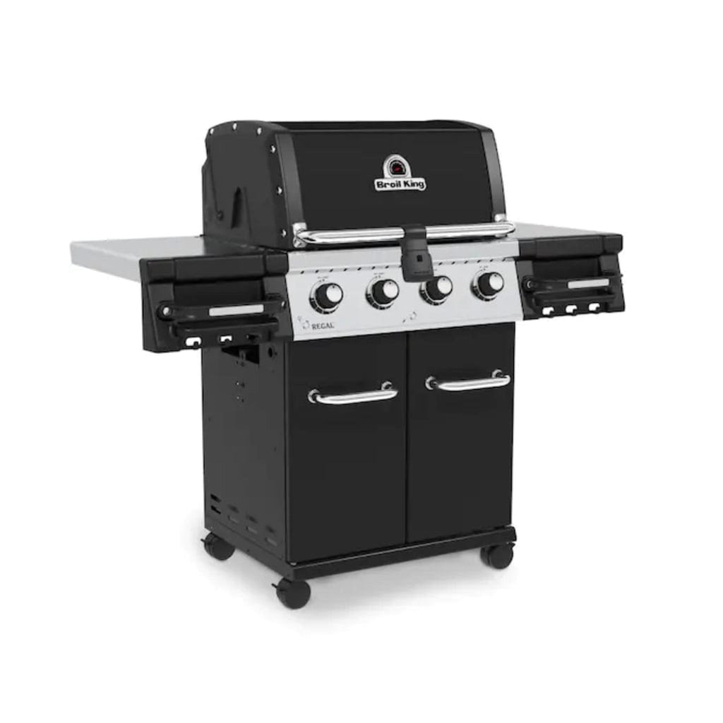 The Regal 420 Pro also includes rust-resistant components, stainless steel side shelves with integrated condiment bins, and heavy-duty locking casters with Level Q™ leg levelers for added stability. Whether powered by propane or natural gas, this grill offers professional-grade performance with practical features built for convenience.