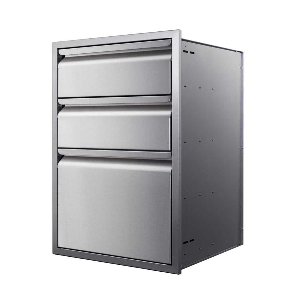 The Memphis 21" Triple Access Stainless Steel Drawer Stack offers a sleek, durable storage solution for your outdoor kitchen. Designed for easy integration, it features three stacked drawers that open and close smoothly with soft-close stainless steel slides.