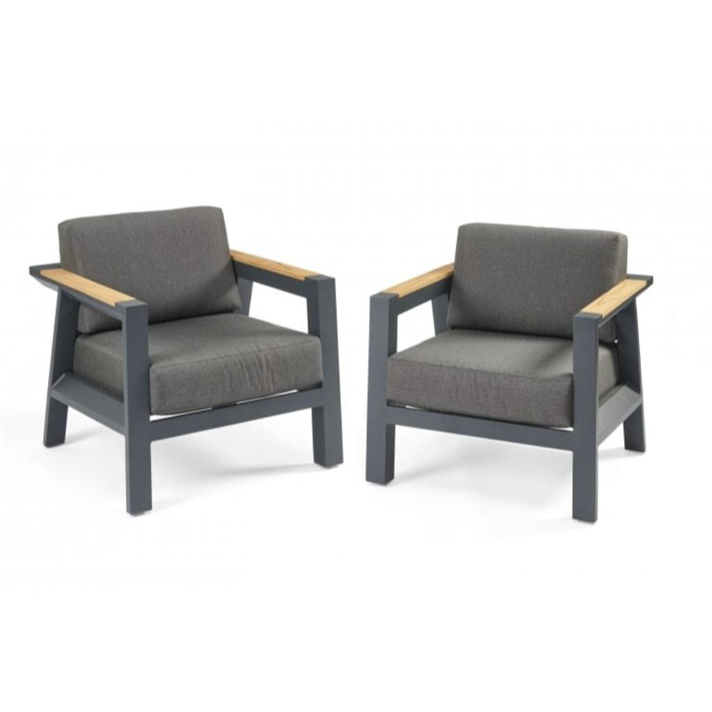 Complete your outdoor room with the comfort and elegance of the Darien Chairs. These modern styled chairs include a powder-coated frame with Grade A teak accents on the armrests. Set of 2.