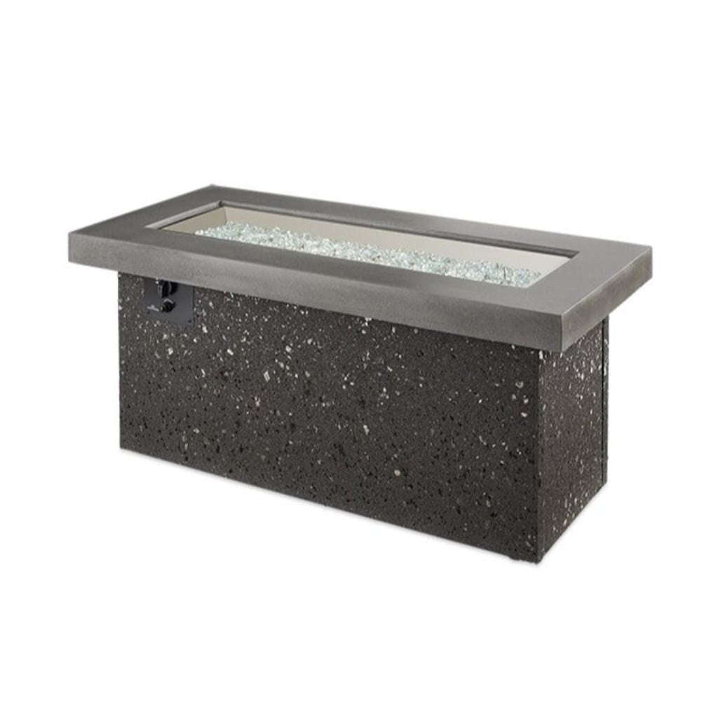 Enhance your outdoor living space with The Outdoor GreatRoom Company Key Largo 54" Linear Gas Fire Pit Table, featuring a sleek Midnight Mist Supercast™ concrete top paired with a black fleck stucco base. This modern fire feature houses a powerful 12" x 42" Crystal Fire® Plus burner that delivers 80,000 BTUs, surrounded by clear tempered fire glass for a shimmering flame effect.